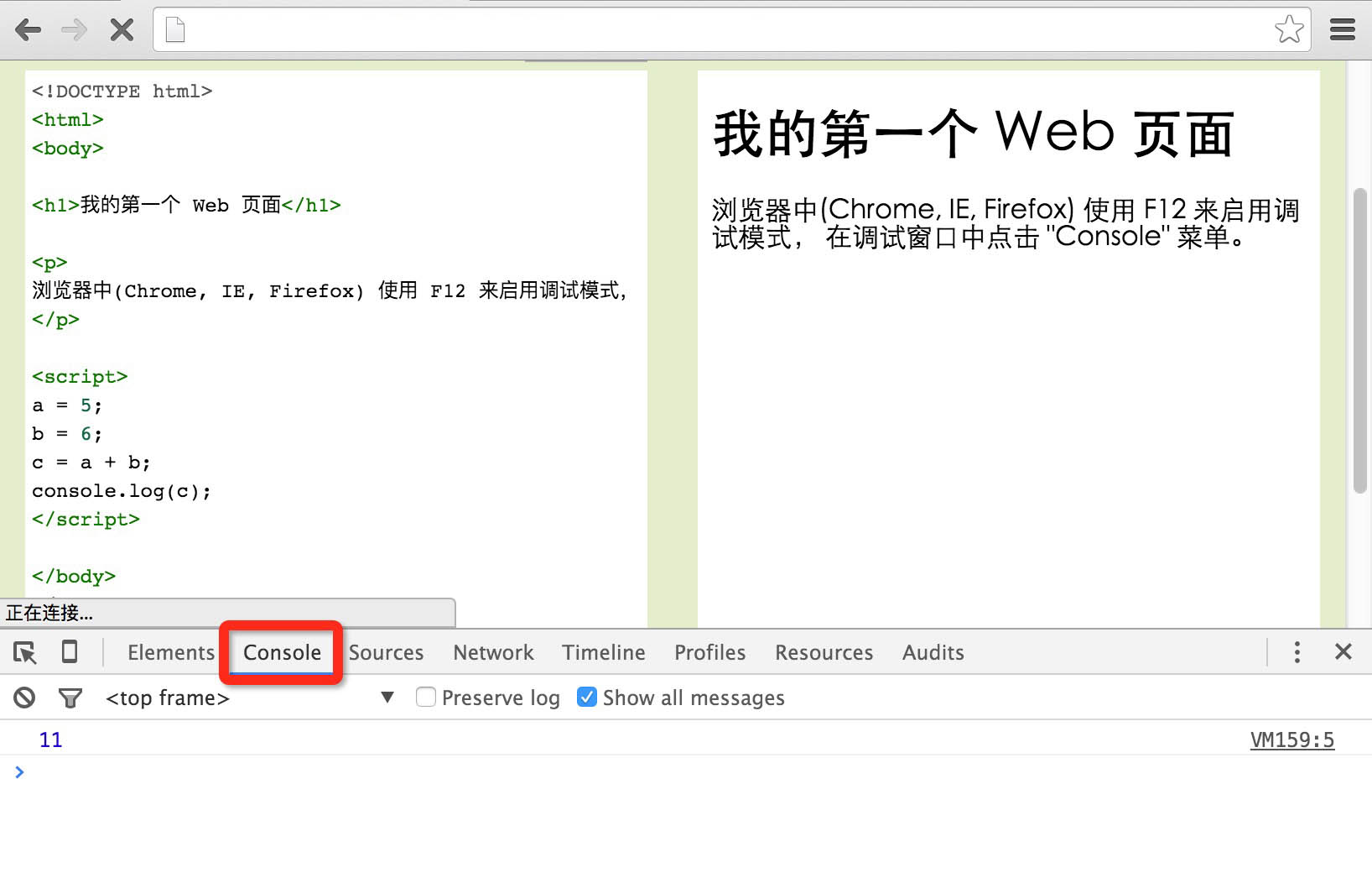 浏览器中使用 F12 来启用调试模式, 在调试窗口中点击 "Console" 菜单。